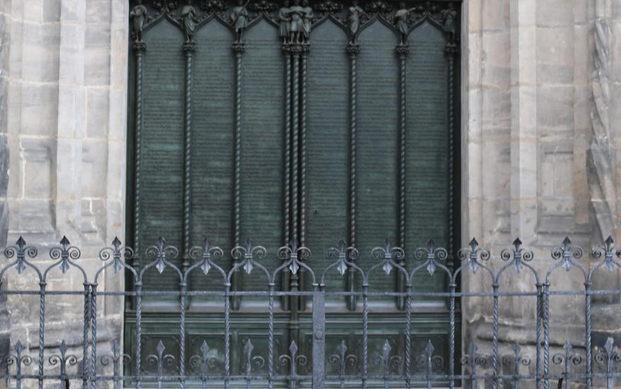 Døren i Wittenberg er ikke den dør, man rejser for at se, for den eksisterer ikke længere. Det er mærkeligt, hvad man rejser efter, hvad der er på spil. At stå i Wittenberg og se på det sted, hvor der engang i 1517 var en dør, som Luther slog en liste på mere end 90 ideer til forandring op, er en særlig ting. Også selvom døren ikke længere er der. Der er en ny dør. Med ideerne på. En dør, som man ikke må gå ind ad, for i dag er indgangen gennem en renoveret bygning, som nok engang var et slot, men som i dag ligner noget fra 1980 måske. Man ser på den kobberdør, man tager et billede.